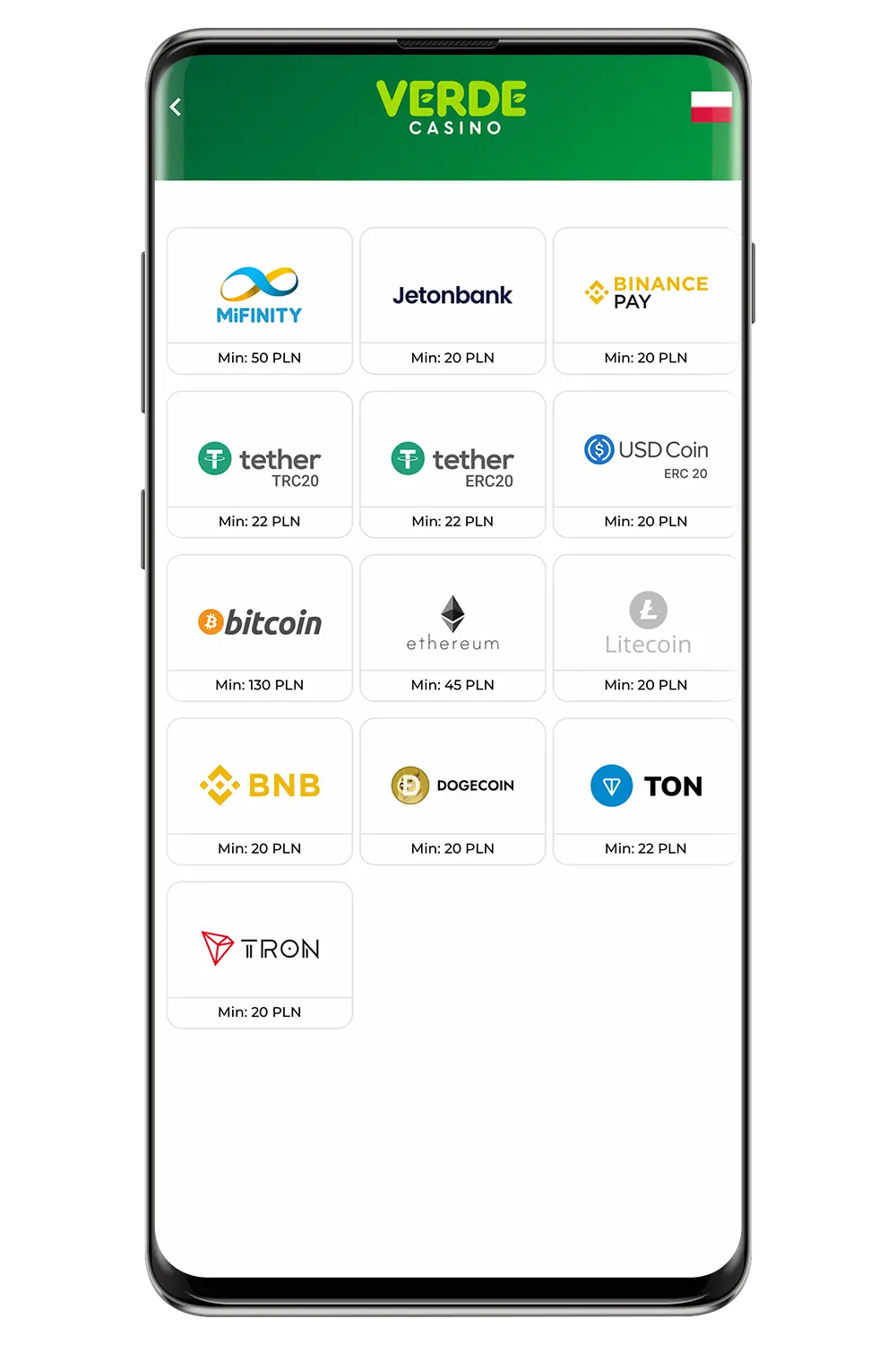 Przygotowane przez Verde Casino płatności pozwalają wpłacać minimalny depozyt od 50 PLN oraz wypłacać od 20 PLN. Kasyno nie pobiera żadnych opłat i prowizji od realizowanych transakcji. Do dyspozycji polskich graczy są różne opcje płatnicze, w tym kody BLIK, karty przedpłacone Paysafecard, e-porfele Skrill i Neteller, a także kryptowaluty.